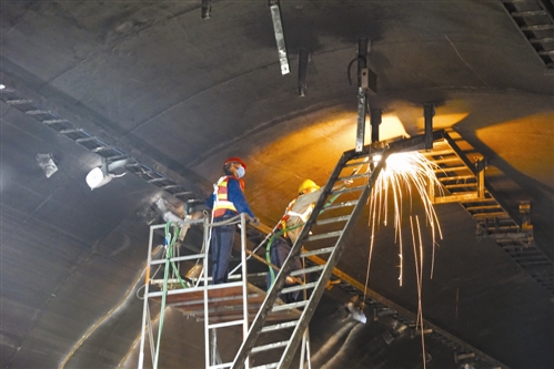 另一處作業(yè)面,負責焊接的王師傅拿著器械,正目不轉(zhuǎn)睛地盯著焊接面。“焊接對精度技術要求很高,焊縫還要檢測,得一次成型,否則施工就不合格。”從事多年電焊工的他常常腰酸腿疼,落下“身疾”,“不過時間久了也就習慣了,堅持就是勝利。”王師傅依然很樂觀地看待自己的工作。