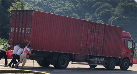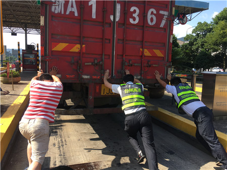 6月19日15時(shí)左右,一輛杭州牌照的大貨車,在進(jìn)入臨海南收費(fèi)所三車道時(shí)突然熄火拋錨,司機(jī)嘗試了幾次無法啟動(dòng),立刻下車檢查車況。 “師傅,怎么了?有什么能幫您?”收費(fèi)員徐海源見此情景,立即上前熱心詢問。 “哎!包在油箱口的塑料紙?jiān)趺淳偷暨M(jìn)油箱內(nèi),現(xiàn)在車子怎么都發(fā)不動(dòng)不了。”司機(jī)有點(diǎn)發(fā)急地回答。 “師傅,別著急,我先找?guī)讉€(gè)同事幫您把車推出車道。”收費(fèi)員趕緊安慰司機(jī)焦急心情。 “好的,那謝謝你們。”司機(jī)連忙點(diǎn)著頭。為了避免車道堵車,徐海源立刻利用對講機(jī)向當(dāng)班班長周萍說明情況,周萍立刻關(guān)閉該車道,啟動(dòng)備用車道。此時(shí)此刻,收費(fèi)員李俊杰、楊旭佳毫不猶豫的趕了過來與駕駛員一起推動(dòng)車子。“一、二、三,一、二、三,使勁呀……”可是車子仍然紋絲不動(dòng)。怎么辦?請求支援!正準(zhǔn)備下班的行政人員陳瑩、劉華萍得知情況后,二話不說飛奔到車道,加入到推車行列中。用力推呀——哎,不行;再來一次——還不行。面對23.97噸的大貨車,大家仍是束手無策。“去找根鐵棒試試!有道是給你一根鐵棒,我能翹起整個(gè)地球。”不知是誰大喊了一聲。“行,可以試試,快去找”話音剛落李俊杰快步跑向所內(nèi),尋找鐵棒。不一會(huì)兒,只見他興奮地高舉鐵棒沖著大家喊道:“找到了!找到了!”