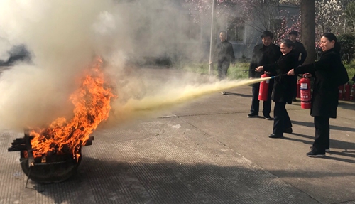 圖為滅火器使用模擬演練現場 “保險栓要先打開。” “用前記得搖一搖。” “不要怕,對準火源再噴,別急。” 隨后,該所開展滅火器使用模擬演練。在演練中,大家利用平時更換下來的舊滅火器,依次輪流進行操作,更有一些老員工主動熱心幫助新員工講解如何正確使用滅火器,以身示范正確操作方式及每一個分解動作要領。