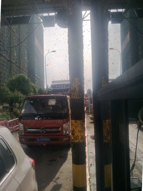 圖為蜜蜂集聚在收費(fèi)站 原來(lái)這輛綠通車運(yùn)輸蜂箱,由于蜂箱沒(méi)有關(guān)閉嚴(yán)實(shí),在車通過(guò)車道檢查稍作停留時(shí),大量的蜜蜂乘機(jī)逃出,圍攻收費(fèi)崗?fù)ぃ炜账查g一片密密麻麻。它們有的停留在車道的防撞柱上,有的在收費(fèi)窗口附近盤旋,遲遲不肯離開,嚇得過(guò)收費(fèi)站等待繳費(fèi)的司機(jī)不敢開車窗繳費(fèi)。
