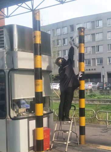 圖為工作人員用殺蟲劑噴射蜜蜂 當(dāng)班副班長(zhǎng)何丹燕立即將車道內(nèi)情況報(bào)告給所領(lǐng)導(dǎo),副所長(zhǎng)何先林聽聞后急急披上雨衣,戴上頭盔和手套,迅速趕到車道,經(jīng)過(guò)簡(jiǎn)單防護(hù)的他用殺蟲劑噴射蜜蜂集聚的位置。與此同時(shí),何丹燕疏導(dǎo)后方車輛從其他車道通行。