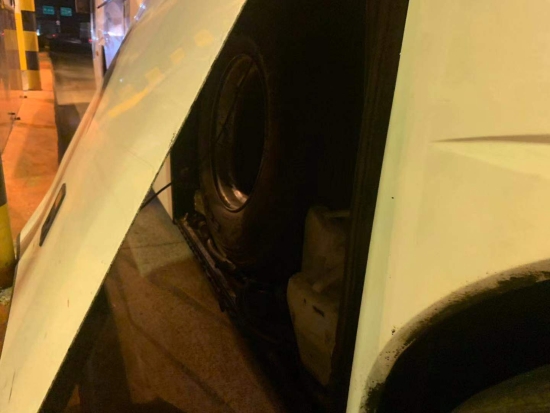 圖為被物品擠開的客車側門 此次事故由于客車車箱內放置過多的物品,在車箱門邊上還硬塞了幾只大輪胎,最終導致輪胎將側門擠開而沒被司機發現,在高速過ETC車道時箱門撞到了設備,司機對此也是后悔不已。 近期,收費站發生過不少同類事件,有司機通過ETC車道時因車速過快未感應到線圈,擋風玻璃撞到欄桿;有集裝箱后門沒關撞到ETC設備。在此提醒過往司乘行車前務必要檢查好車輛安全情況,過ETC車道需要慢行。如果在高速上出現突發情況也不要慌張,及時向工作人員或者撥打求助電話請求幫助。 楊相暖