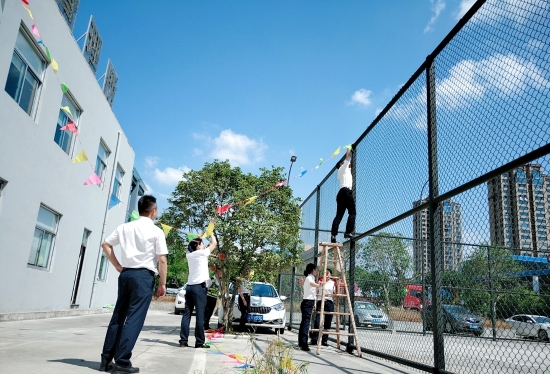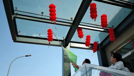 圖為工作人員一起布置收費所 在慶祝祖國70周年生日的日子里,最火的顏色就是紅色。為了弘揚中華民族傳統(tǒng)文化,溫嶺西收費所后勤組早早購置了燈籠、彩旗、五星紅旗,寫好“慶祝祖國70周年華誕”大字等。黨員帶頭,團員緊跟,一線收費員紛紛參與,在收費站大門口、辦公樓、食堂、宿舍等區(qū)域精心用五星紅旗、大紅燈籠、五顏六色的彩旗裝點,一抹抹艷麗的國旗紅,成為站點最靚麗的風景。明亮的黃、鮮艷的紅,美麗窗口突然亮了起來,到處洋溢著濃濃的國慶氛圍,為過往司乘提供暢、潔、美的節(jié)日行車環(huán)境。 溫嶺西收費所后勤組還精心策劃、精細編排,制作了具有特色、獨具創(chuàng)意的生日祝福“小視頻”,祝祖國生日快樂! 通過開展弘揚愛國精神,喜迎國慶活動,溫嶺西收費所全所工作人員更加不忘初心,砥礪前行,共同慶祝祖國70周年華誕。 鄭霞霞