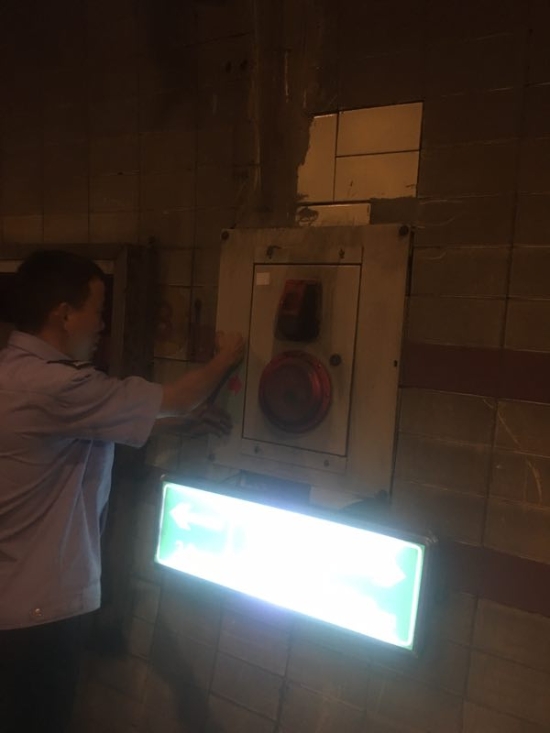 圖為張貼火災報警提示標語 此次隧道清洗工作主要針對隧道內的機電設施維修與保養,清潔監控和照明燈,修復故障攝像機;檢修消防設施,如火災報警采用點火測試、手動報警、緊急廣播和電話測試,以及檢查消防箱;隧道內指示標記檢查,如人通、汽通檢查保養,隧道風機檢測,貼安全提示標志,修復提示燈等。 隊員們放棄休假,加班加點,借著隧道清洗一類施工的有利條件,把隧道內需報修的各種設備進行維修和保養,保障了隧道內機電、消防設施的正常運行,排除安全隱患,為即將到來的中秋小長假提供明亮、安全的隧道行車環境。 陳智慧
