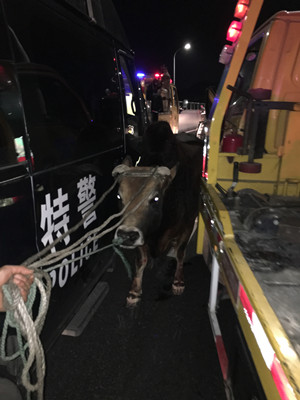 警報(bào)拉起,警燈閃爍,猛牛在施救車(chē)和巡邏車(chē)護(hù)送下,走過(guò)黃土嶺隧道,并在警車(chē)引導(dǎo)下,走向臺(tái)州收費(fèi)所出口。晚7:00時(shí)在即將出口時(shí),牛開(kāi)始受驚,四處突圍,為避免事故,飛速趕過(guò)來(lái)的臺(tái)州110特警擊中了牛蹄,制伏了開(kāi)始發(fā)瘋的牛。費(fèi)了老大力氣,特警、交警及施救人員總算合力將牛抬上施救車(chē)安全帶下了高速公路 。 據(jù)悉,這起事件由于一輛運(yùn)牛的貨車(chē)沒(méi)有做好安全措施,行駛過(guò)程中,牛逃下了車(chē)。所幸,處置到位,沒(méi)有釀成安全事故 。 鄭蔚