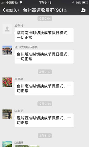 圖為收費(fèi)模式切換時的微信工作交流群 加強(qiáng)宣傳,主動引車流。集團(tuán)網(wǎng)站、微信公眾號等媒體提前發(fā)布通行提示,解釋國家免費(fèi)通行政策,引導(dǎo)司乘人員錯峰出行。在各收費(fèi)所路段進(jìn)口附近重要岔口提前布置臨時限行指示牌,提醒過往貨車避開高峰時段。高速主線上利用電子顯示屏、可變情報板等手段及時通報路況,引導(dǎo)車輛通行。
