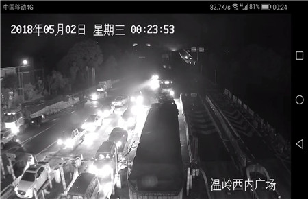 5月1日8:27分,黃土嶺隧道發(fā)生多起多車追尾現(xiàn)象,事故現(xiàn)場仿佛貪吃蛇,二車追尾、三車追尾、四車追尾,特別是四車追尾現(xiàn)場,除了追尾車輛車頭凹陷變形,被撞車輛車尾面目全非外,一輛白色SUV更是被后車頂?shù)角耙w上,3名司乘人員受傷。隧道所監(jiān)控員洪慧雯不斷切換鏡頭,向指揮中心、醫(yī)院發(fā)出報告;早已到達的隧道所執(zhí)勤隊已在現(xiàn)場維持秩序,引導后方車輛通行,為交警、急救和施救車輛開通生命通道;與此同時,臺州、臺州南和溫嶺西收費所暫時關閉寧向入口。
