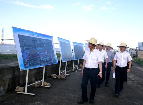 圖為臺州市副市長張加波實地察看海門港埠碼頭與新港區規劃建設用地 烈日下,調研組分別實地察看了海門港埠碼頭與新港區規劃建設用地。結合海門港埠總公司現狀用地區域圖及新碼頭選址方案圖展板,羅小將詳細介紹了港區碼頭目前區域現狀及新港區選址規劃設想方案,提出了港區剩余土地利用、建設項目規劃許可、新港區建設用地征遷安置等需要政府相關部門和椒江區政府大力支持的問題。