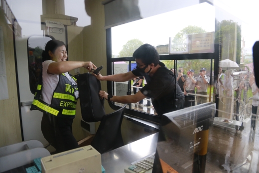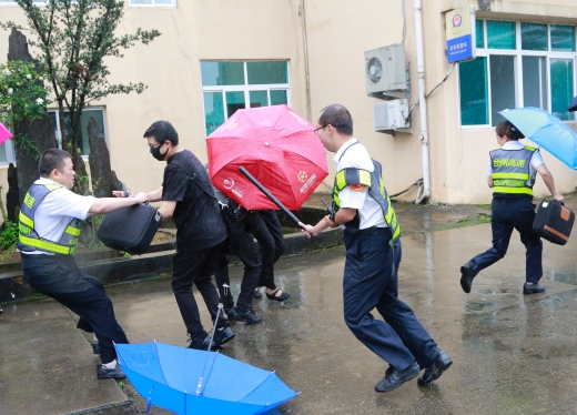 隨后,多名參演員工冒雨模擬收費(fèi)崗?fù)ず土嘘?duì)下崗遭遇“歹徒”搶劫的情景開展防盜搶演練?,F(xiàn)場(chǎng),2名蒙面歹徒執(zhí)仿真刀、軟棍威脅收費(fèi)員交出現(xiàn)金,危機(jī)之中,收費(fèi)站立即啟動(dòng)應(yīng)急處置預(yù)案并報(bào)警求助,收費(fèi)員有效與歹徒周旋,應(yīng)急處置組人員迅速攜鋼叉、橡膠棒、勞動(dòng)工具等赴現(xiàn)場(chǎng)支援,值班領(lǐng)導(dǎo)、收費(fèi)班長(zhǎng)、監(jiān)控員合力協(xié)作應(yīng)對(duì)歹徒,防盜搶演練順利結(jié)束。