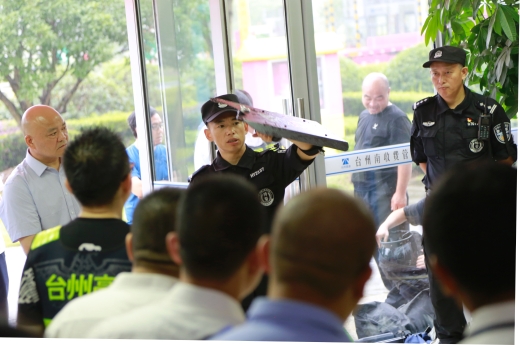 本次活動(dòng)分成防暴器械使用培訓(xùn)、器械使用練習(xí)和防盜搶應(yīng)急演練三個(gè)環(huán)節(jié),以培訓(xùn)和演練相結(jié)合的形式開展,以有效提高一線職工防暴器械使用技能和突發(fā)事件應(yīng)急處置能力?;顒?dòng)邀請(qǐng)了黃巖公安分局巡特警大隊(duì)大隊(duì)長(zhǎng)盧健星,該大隊(duì)獵豹突擊隊(duì)隊(duì)員、專職教官盧尚明到場(chǎng)指導(dǎo)。