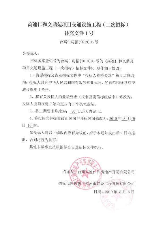 高速仁和文鼎苑項目交通設(shè)施工程(二次招標(biāo))補(bǔ)充文件1號