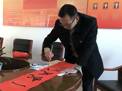 上聯(lián)“自強(qiáng)不息吉慶到”、下聯(lián)“厚德載物福運(yùn)來(lái)”,橫批“喜迎新春”,個(gè)個(gè)遒勁有力的大字從筆尖輕快地躍出,行云流水的書法讓在場(chǎng)人員無(wú)不拍手叫好。所長(zhǎng)孫明偉亮出絕活,揮毫潑墨,豪邁大氣地?fù)]寫著一幅幅春聯(lián)。